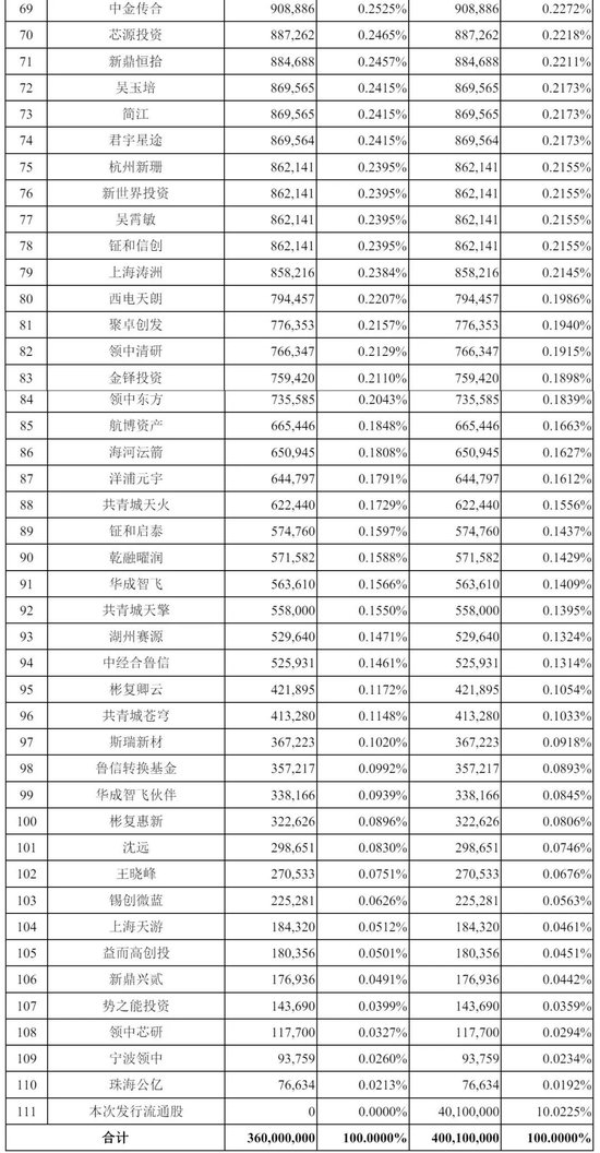 芜湖博霖、兆迪投资分别持股为0.6162%,马鞍山领衔持股为0.5915%,复朴投资持股为0.5588%,央视融媒体持股0.51%,光易投资持股为0.4929%,君晨投资持股为0.4894%,中瀛扶摇持股0.4831%,盈科新投资持股为0.4403%,中金战新持股0.4208%,融泰成德持股为0.4203%,新鼎贰陆、新鼎贰玖、守正麒麟、渤辉投资分别持股为0.3991%;