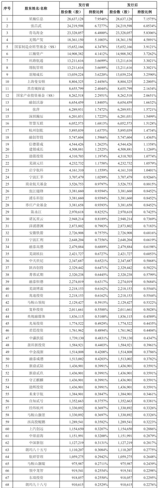 IPO后,星瀚信息持股为7.1575%,张昌武持股为6.0534%,青岛海金持股为5.8306%,无锡产发持股为4.5891%,国家制造业转型基金(SS)持股为3.9121%,江瀚资产持股为3.7262%,丝路航通、翊航管理分别持股为3.3021%,羽翔成长持股为3.2590%,上海曼安顿持股为2.2005%,共青城探索持股为2.1634%,国家产业投资基金(SS)持股为2.0651%;
