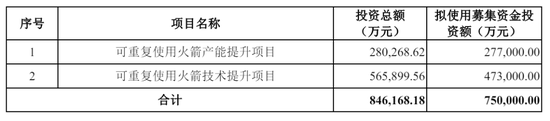 蓝箭航天计划募资75亿元,其中,27.7亿用于可重复使用火箭产能提升项目,47.3亿用于可重复使用火箭技术提升项目。