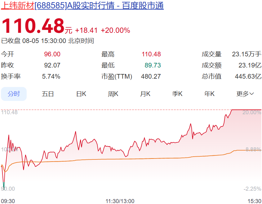 科创板交易大厅的显示屏上,代码688585的红色数字疯狂跳动,110.48元/股的涨停价,将这家浙江新材料企业推向445亿市值巅峰。