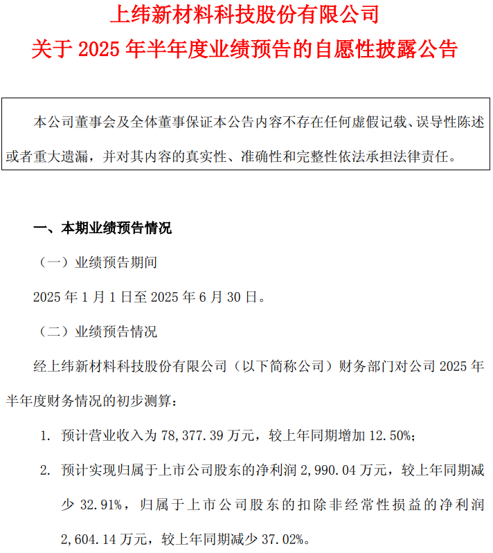 8月5日,上纬新材结束三个交易日的停牌核查复牌交易。开盘仅12分钟,买盘汹涌推升股价,直至收盘封死涨停板,单日成交额飙至23亿元以上。这已是该股一个月内第七次触及严重异常波动,而此刻距离它发布净利润同比下滑32.91%的半年业绩预告,还不到24小时。