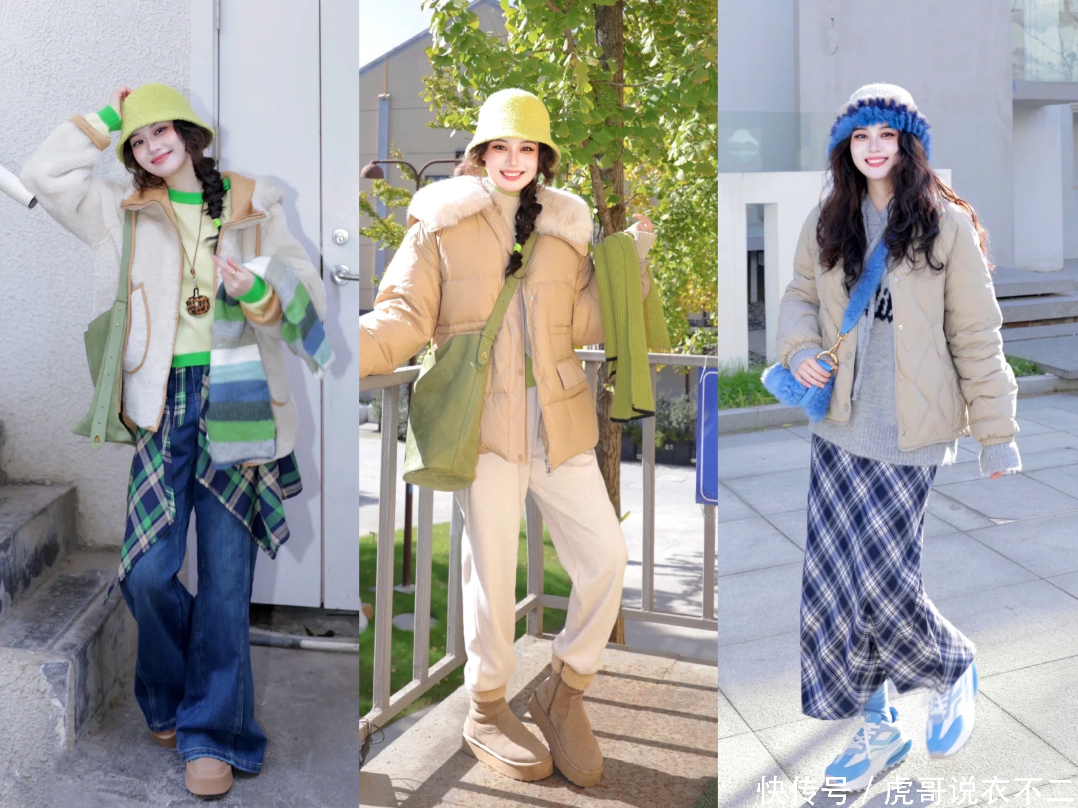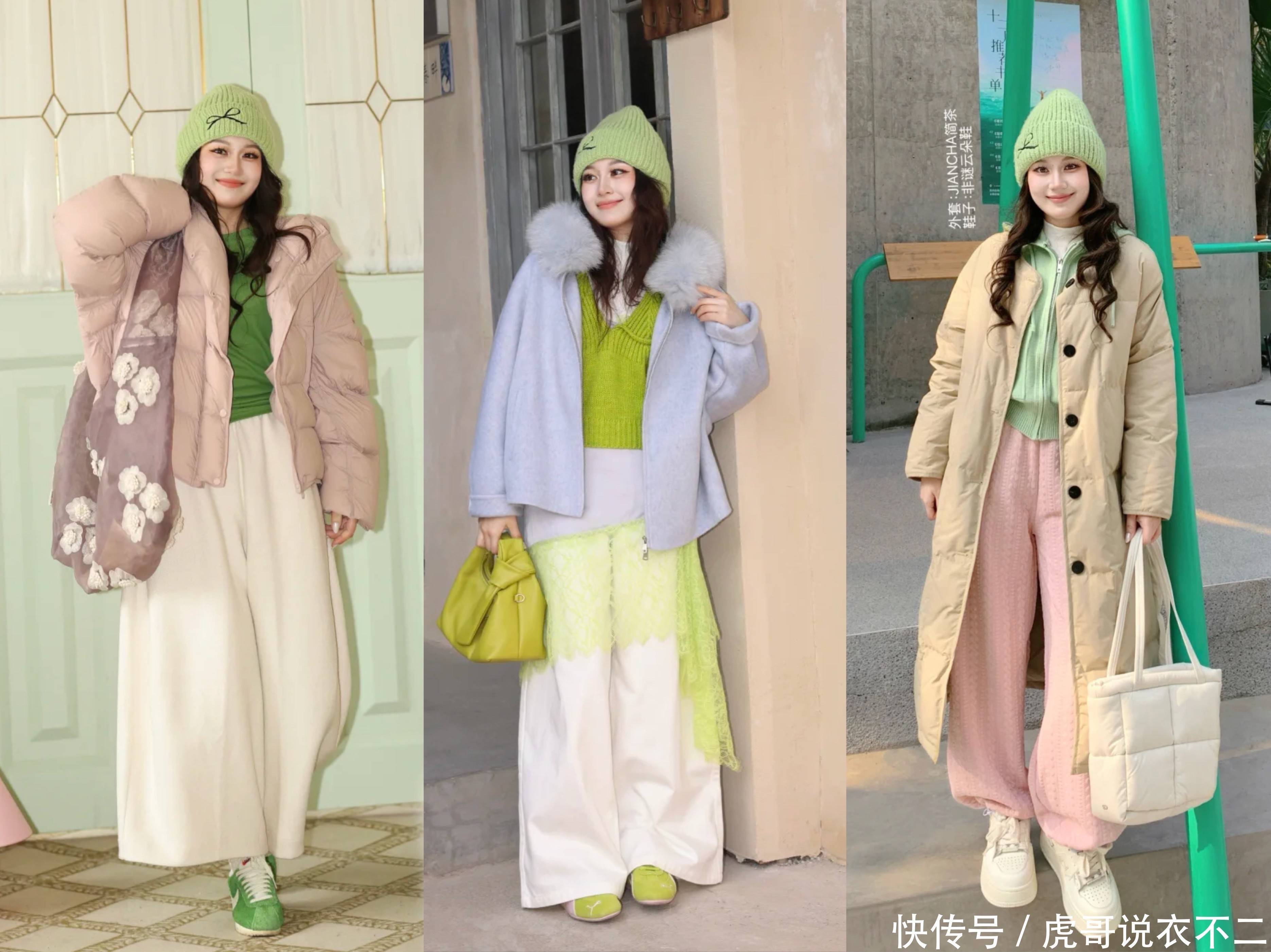 我们常说一套穿搭中的颜色最好控制在三个以内,博主的彩色系单品组合就遵循了色彩搭配法则,比如浅蓝色外套叠穿绿色毛衣,裸粉色羽绒服叠穿绿色打底,虽然两件单品都是不同的彩色,但都属于是邻近色。