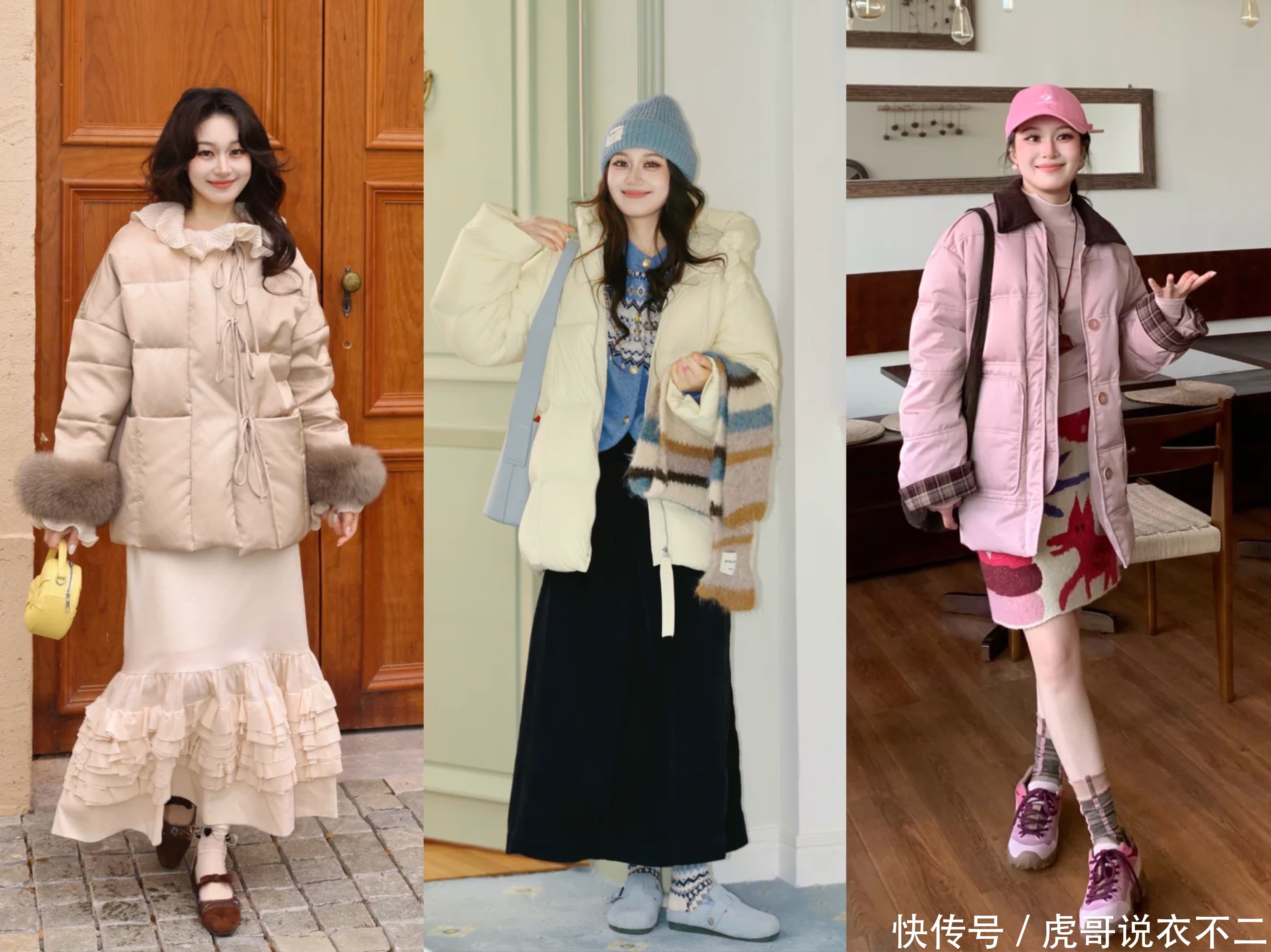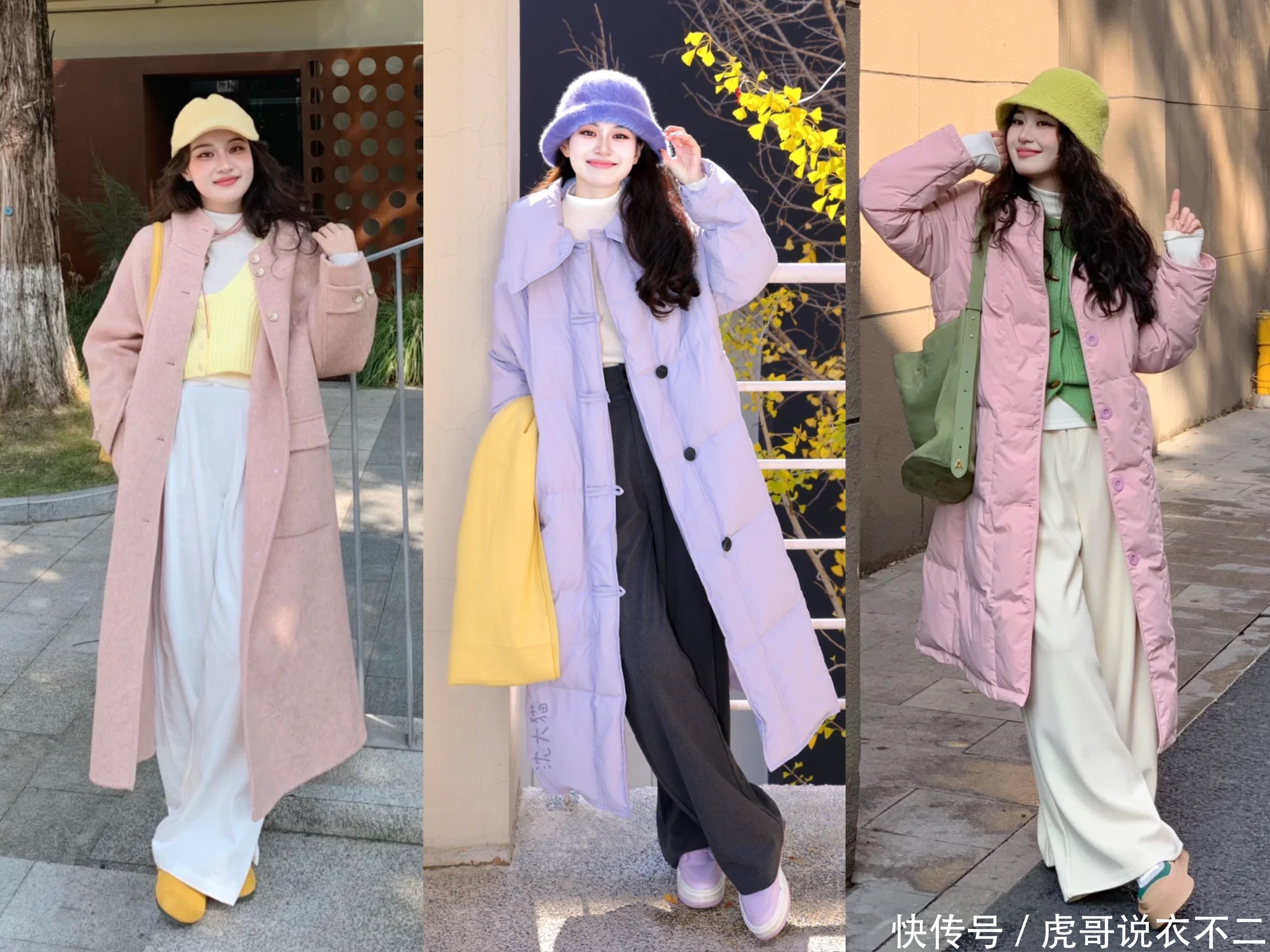 彩色系长款外套,比如粉色、紫色、大衣、羽绒服等,色彩尽量选择相对柔和的浅色或者莫兰迪色系,因为长款外套占的面积比较大,如果颜色太鲜艳则搭配难度会提高,而内搭或者下装可以选择黑白灰等基础色,这样搭配不易出错而且会让整体造型氛围感十足。