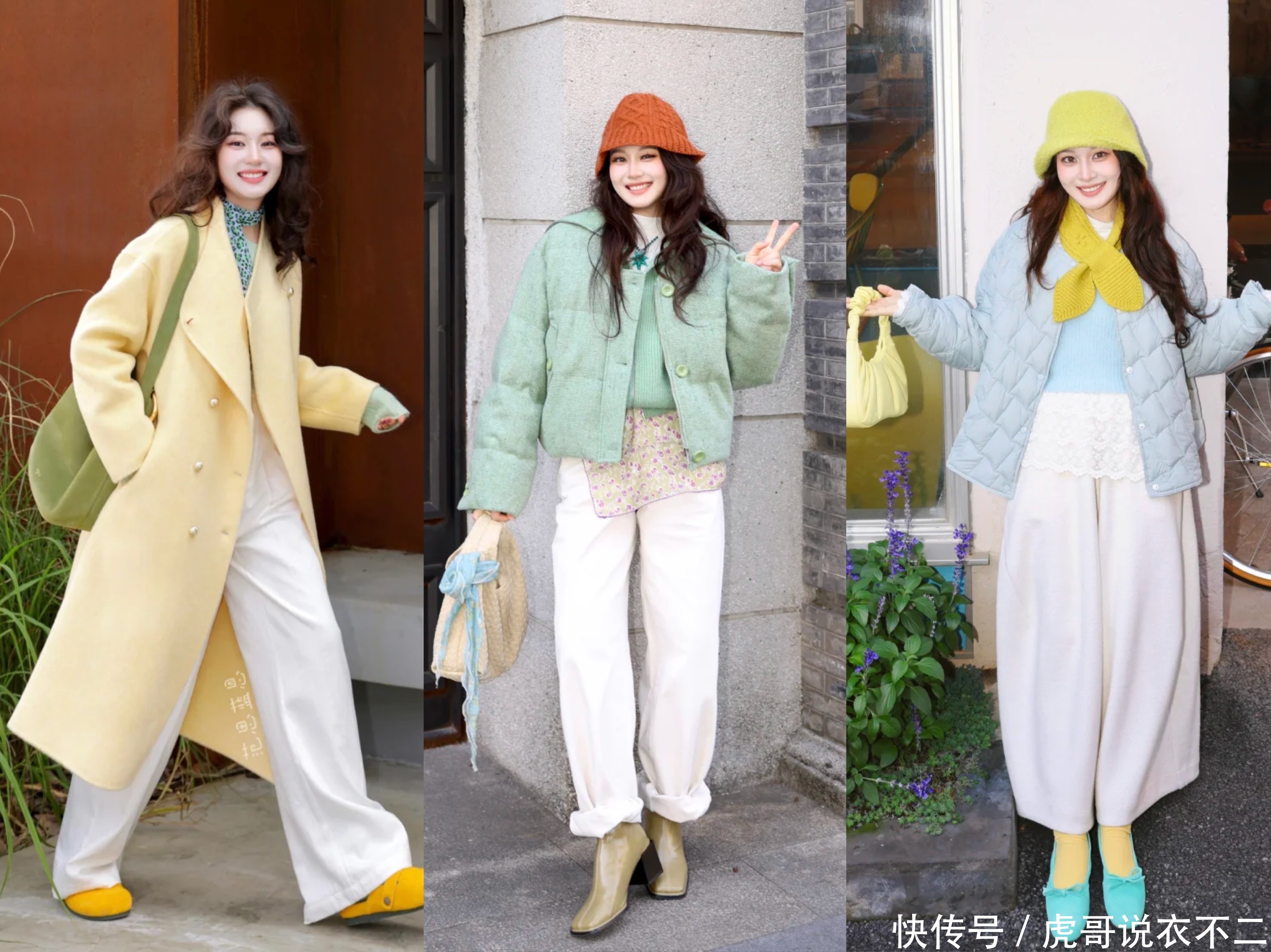 其次,我们在选择彩色系单品时,可以尽量去选择相对柔和的莫兰迪色系,比如这种加入了灰度的彩色系通常比较柔和,也更显温柔,搭配起来更简单,与基础色的碰撞都非常的出彩。比如浅黄色大衣+白色裤装,浅绿色羽绒服+白色裤子等。