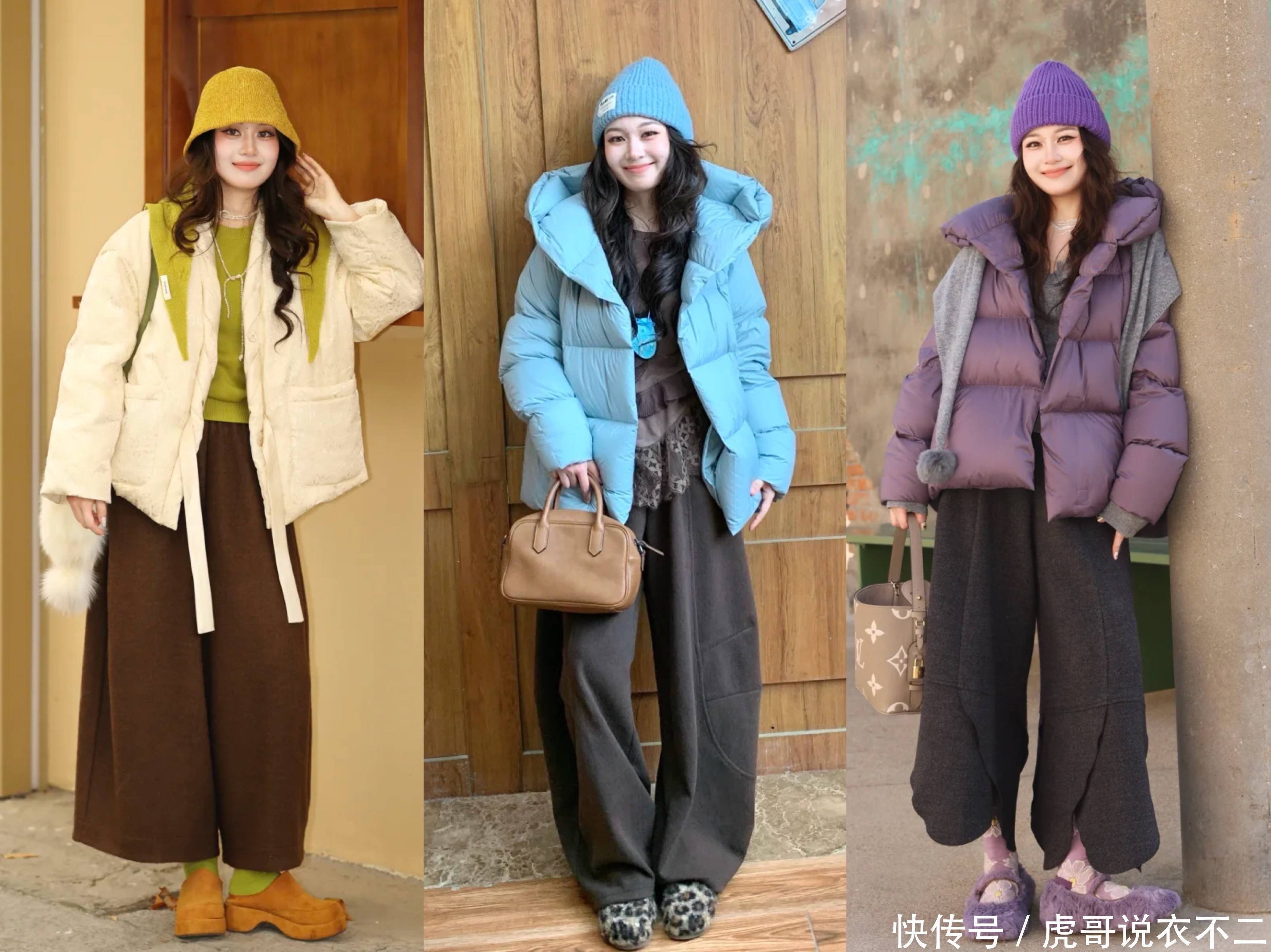 彩色系单品除了搭配白色下装,深色系的下装也是冬季穿搭的必备,比如蓝色或者紫色羽绒服外套,搭配深灰色的裤子,深灰色可以更好的压制彩色系带来的视觉张力,让整体造型显得不那么夸张又充满了活力感。