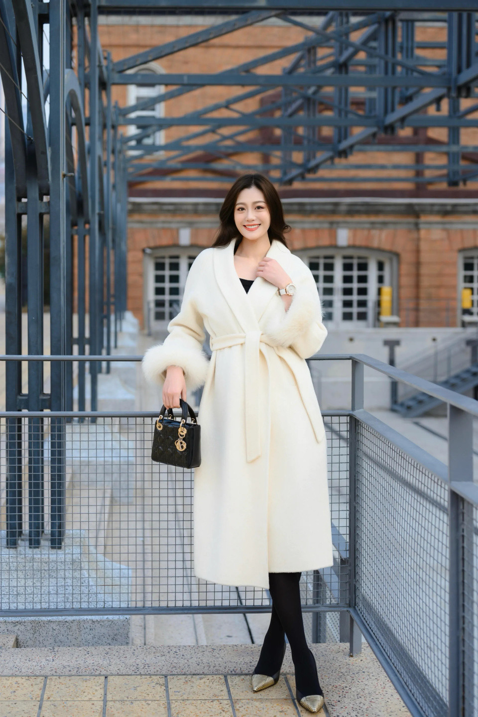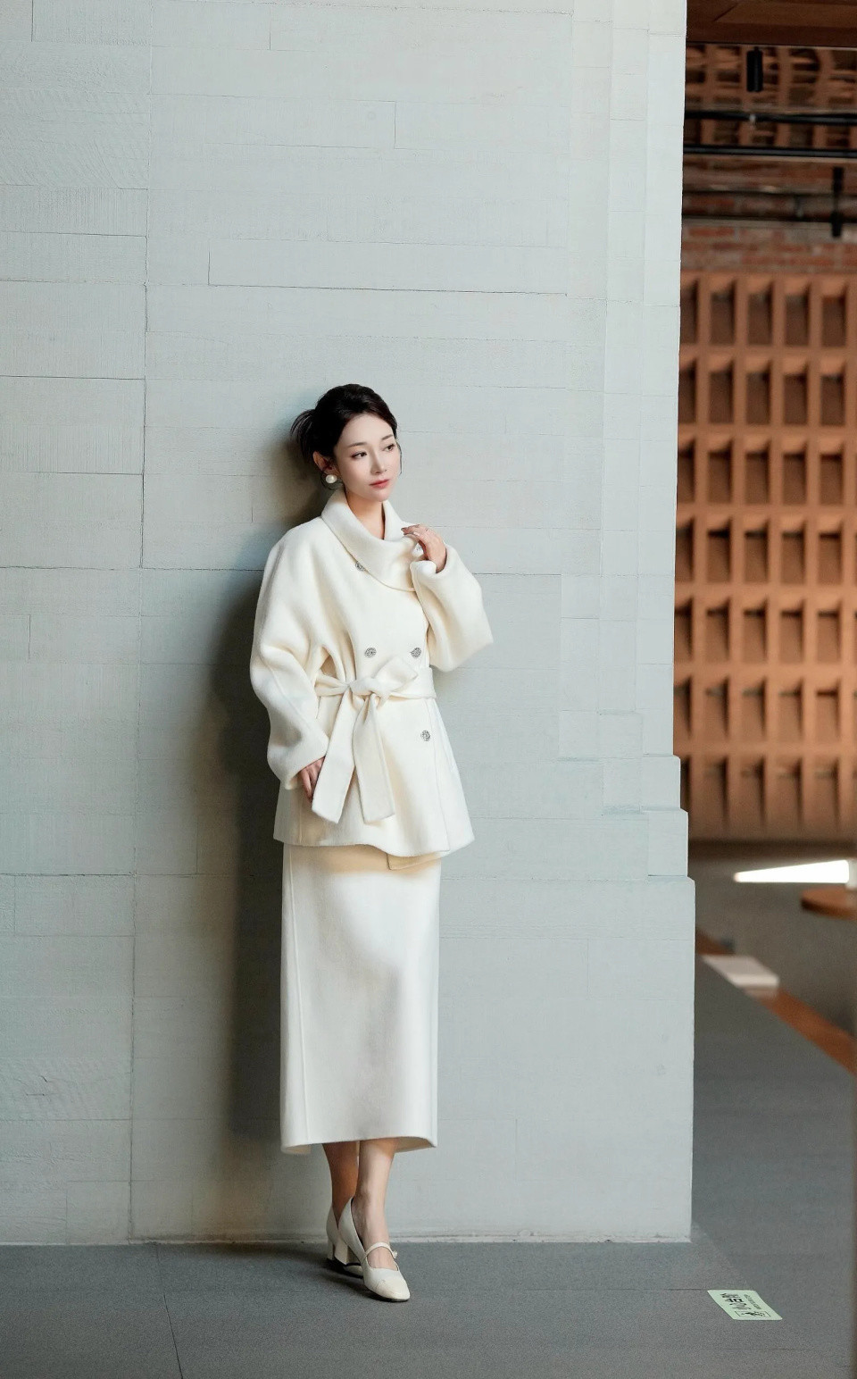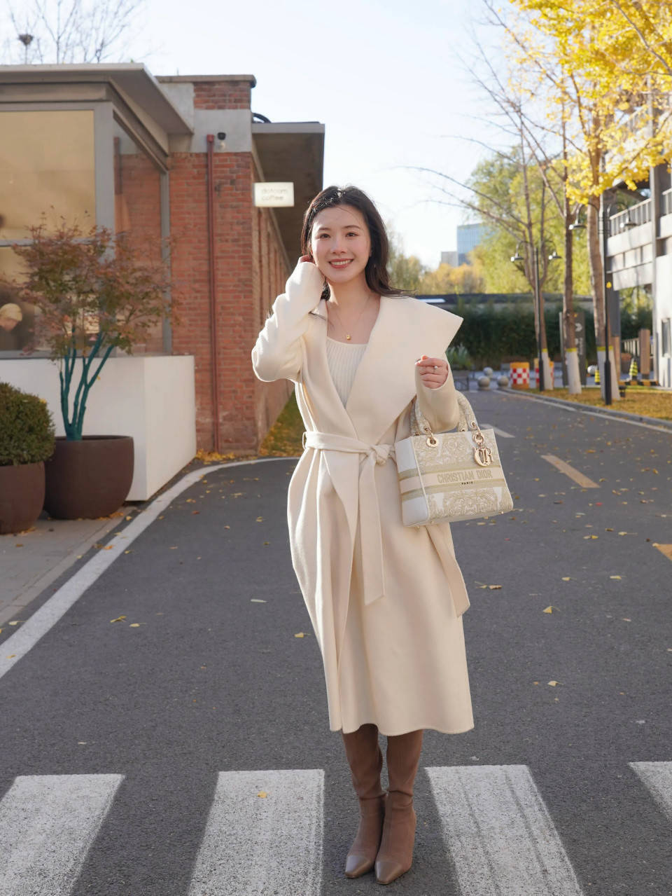 冬晨微光初透,街巷覆着薄霜,一件白色大衣便成了雪落人间的续篇。它不争不抢,却自有一份清冽的底气——领口微扬,是风骨;廓形利落,是态度。