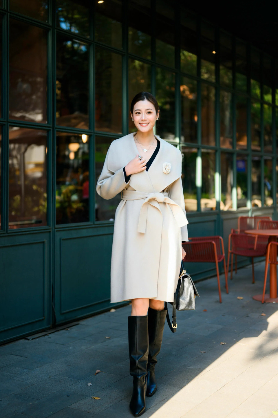 小个子女生可以选择短款的大衣外套来穿搭,长度正好卡在胯骨与大腿中间的位置,而且尽量是 X 版型,自带腰带的大衣,才能更好的修饰你的身材比例,提升你的腰线。