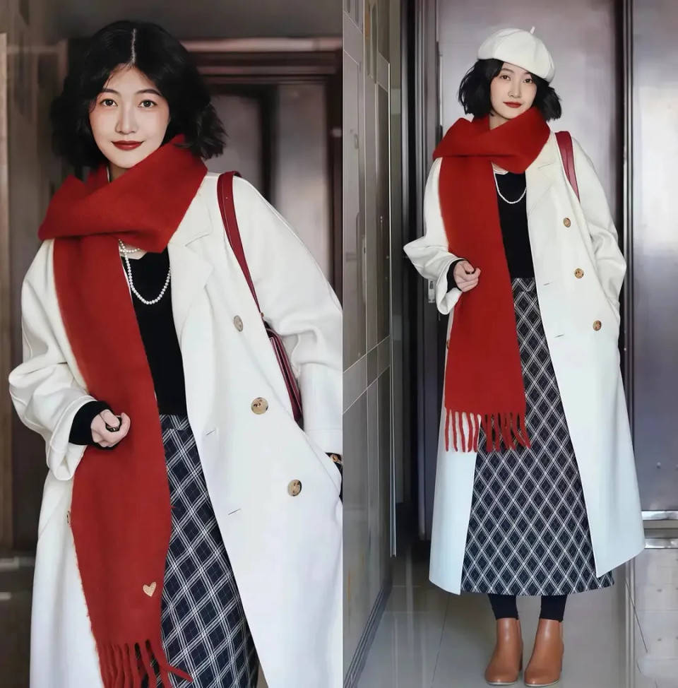 过年回家想让自己的穿搭更喜庆,可以选择最为经典的白色大衣内搭黑色毛衣,再加上这一条高腰收腰款的菱形格纹 A 字半身裙,就能很好的呈现出高挑纤瘦的身材,同时再加上红色的围巾,红色的包包来点缀,就能够使得穿搭者朝气蓬勃,活力感满满。