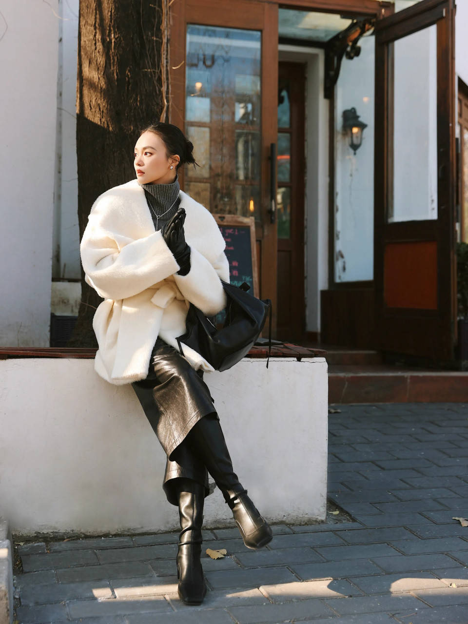 当然也要适当的懂得配色,才能提升整体造型的气质感。例如上面这一件,大翻领的白色大衣,内搭黑色 V 领针织打底衫,加上黑色的中筒靴,黑白组合色彩最经典。