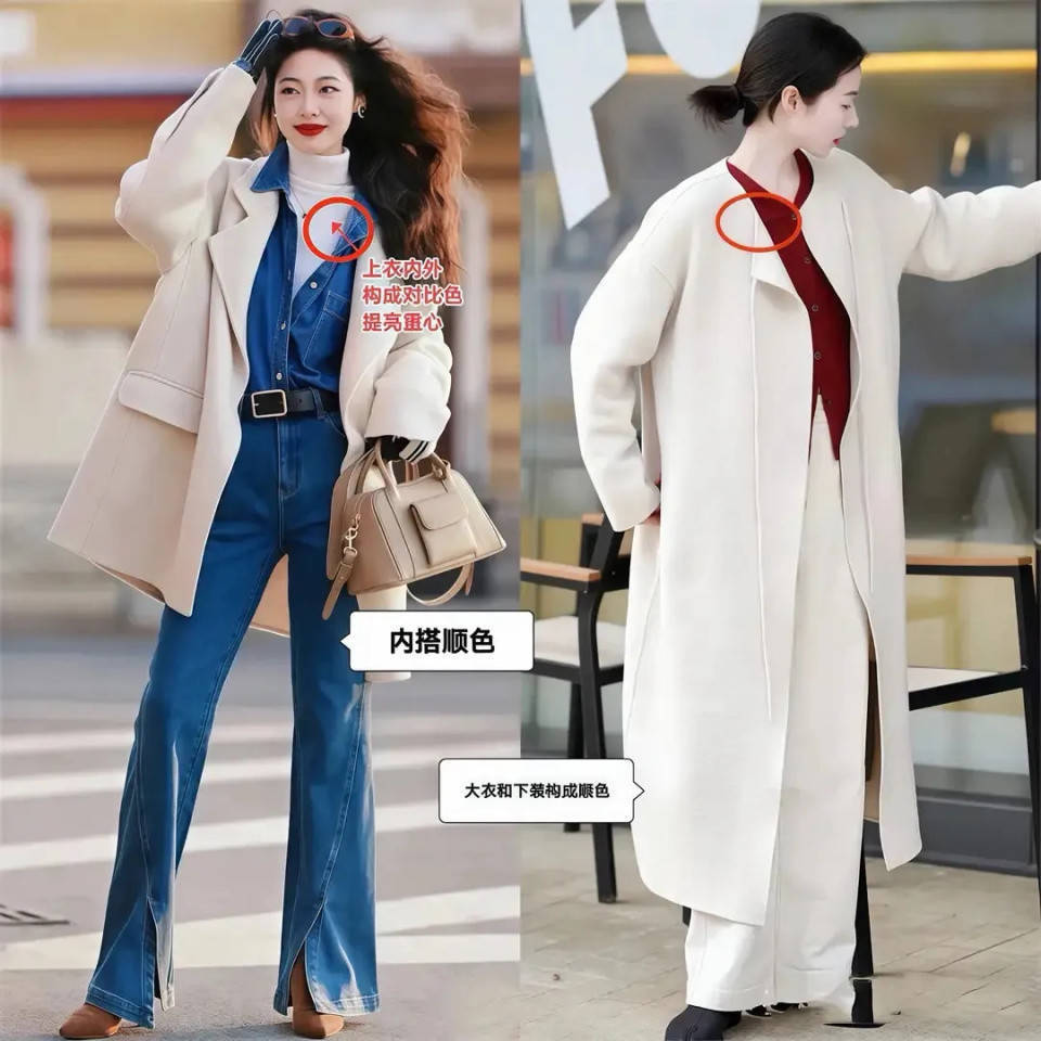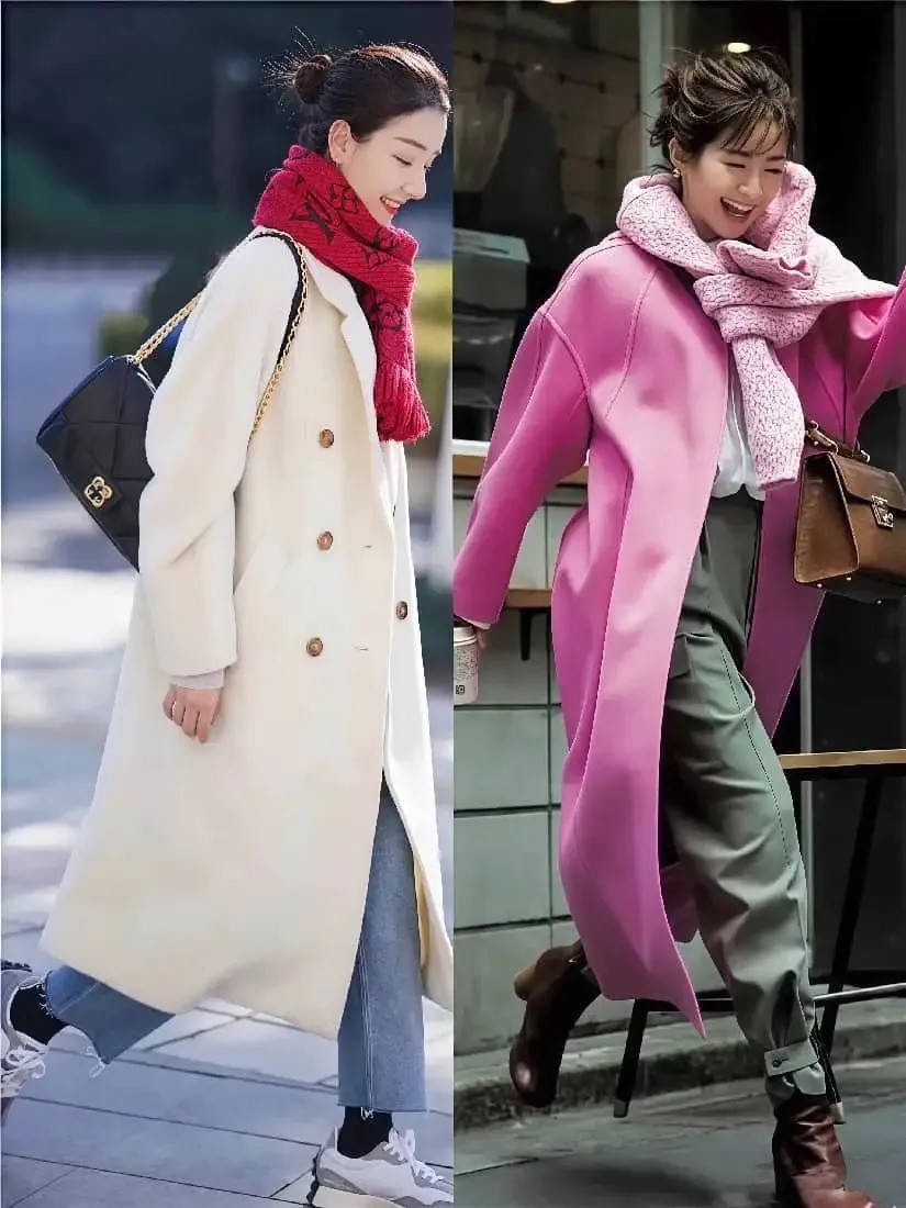 就好比上面这两位时尚博主的穿搭对比,白色大衣 VS 粉色大衣,白色更不挑人,粉色穿在身上很考验人的气质。